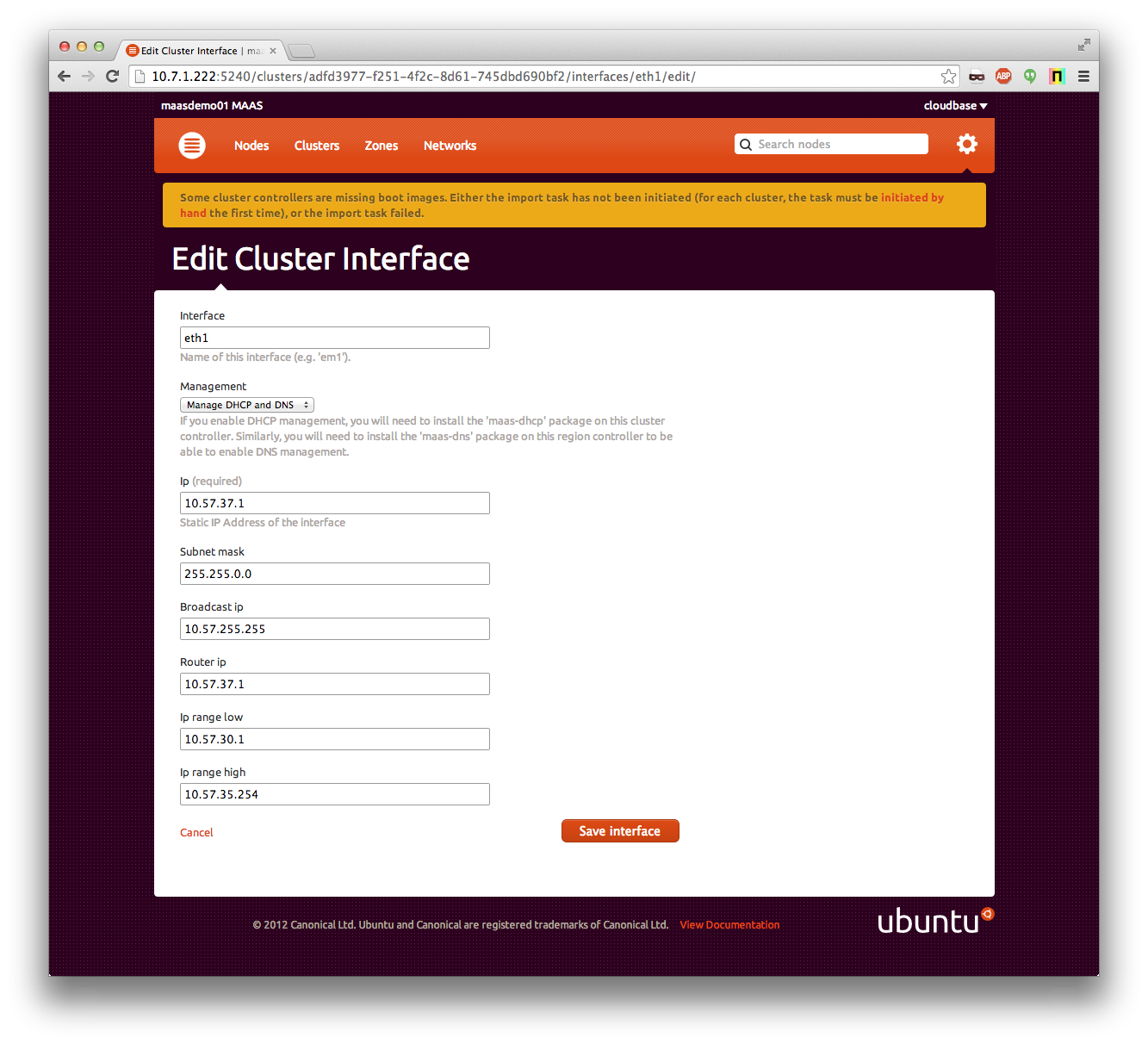 NOTE: When asked for the Ubuntu MAAS API address, double check the detected URL uses ens3’s (external) IP address: http://192.168.122.157/MAAS/. You can later change this by running: